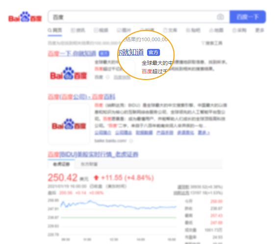 高级版触发词审核通过并生效后,当网民精确搜索该触发词时,若认证通过的精确网址出现在搜索结果中,将为其展现蓝色“官方”标识。